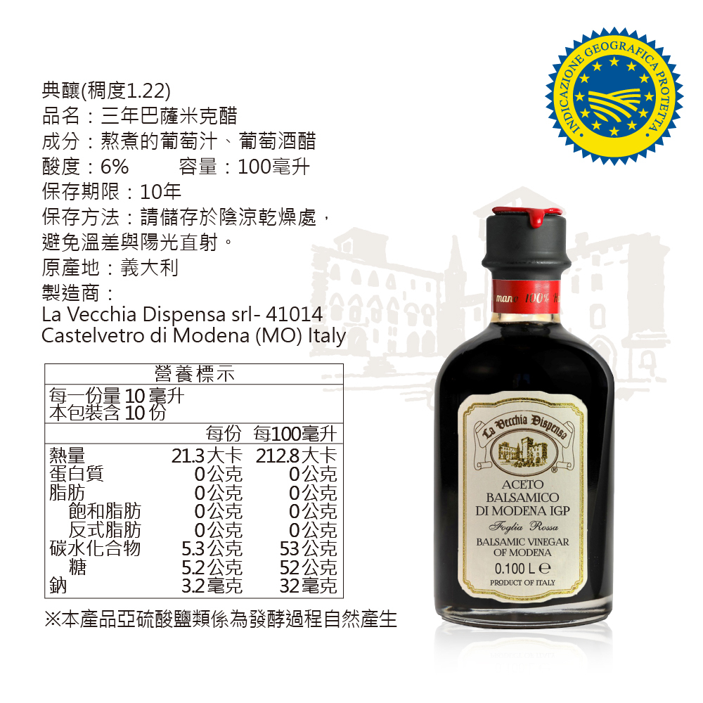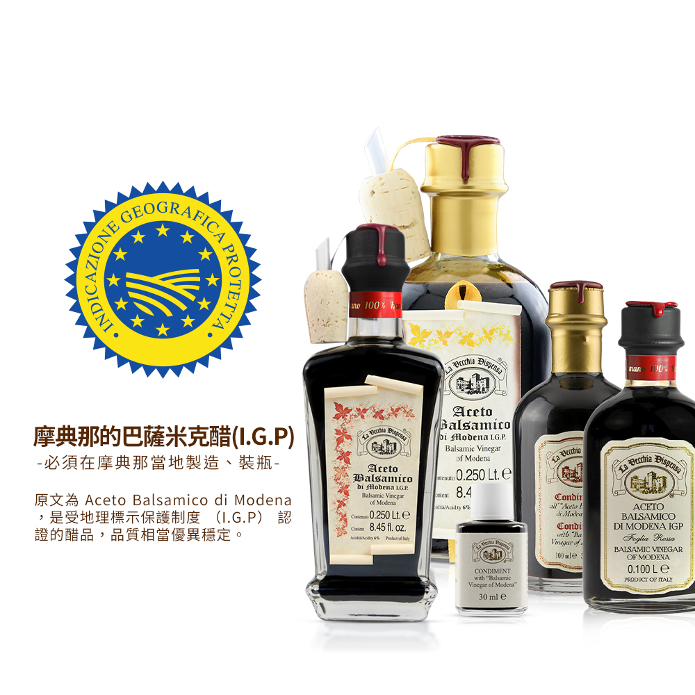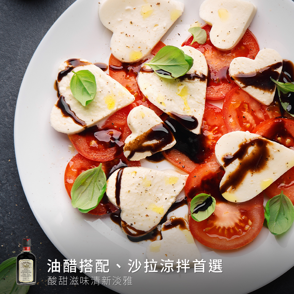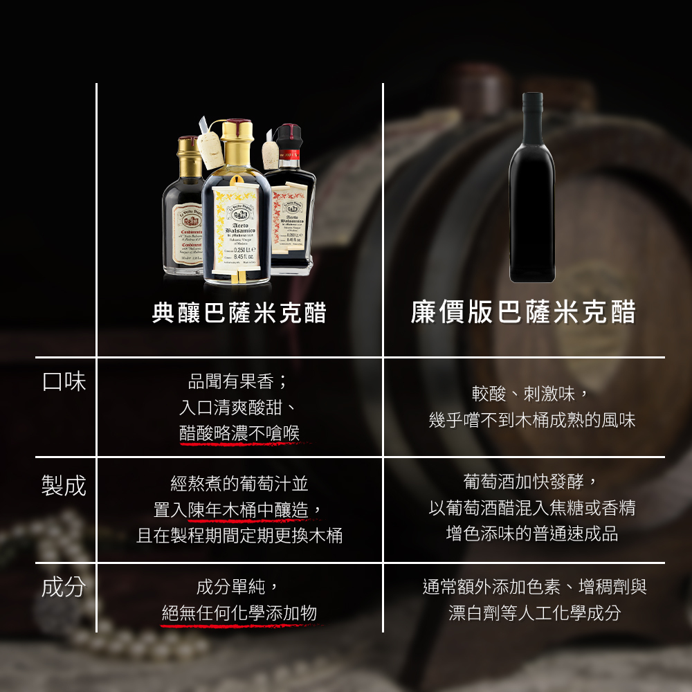 巴薩米克醋為義大利頂級香醋,起源雖已佚失,傳統卻代代傳承至今,並經職人匠心發揚光大。典釀為摩典那百年醋廠,堅持以古法熬煮、濃縮葡萄汁,不添加化學成分,僅透過古老木桶與時光陳釀。