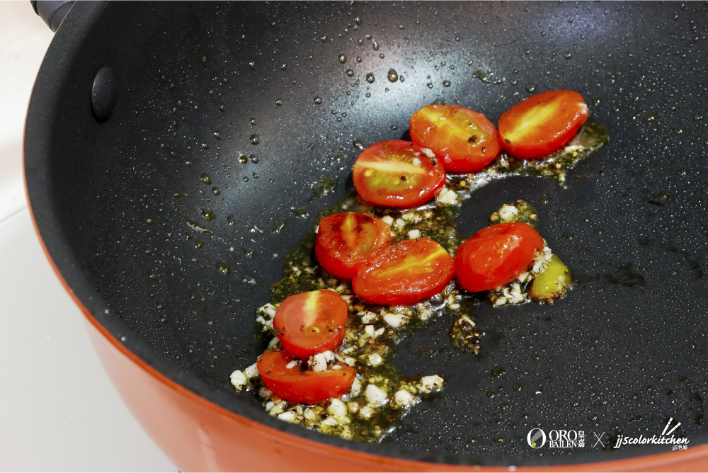 以中火將⼩番茄煎軟至出汁。