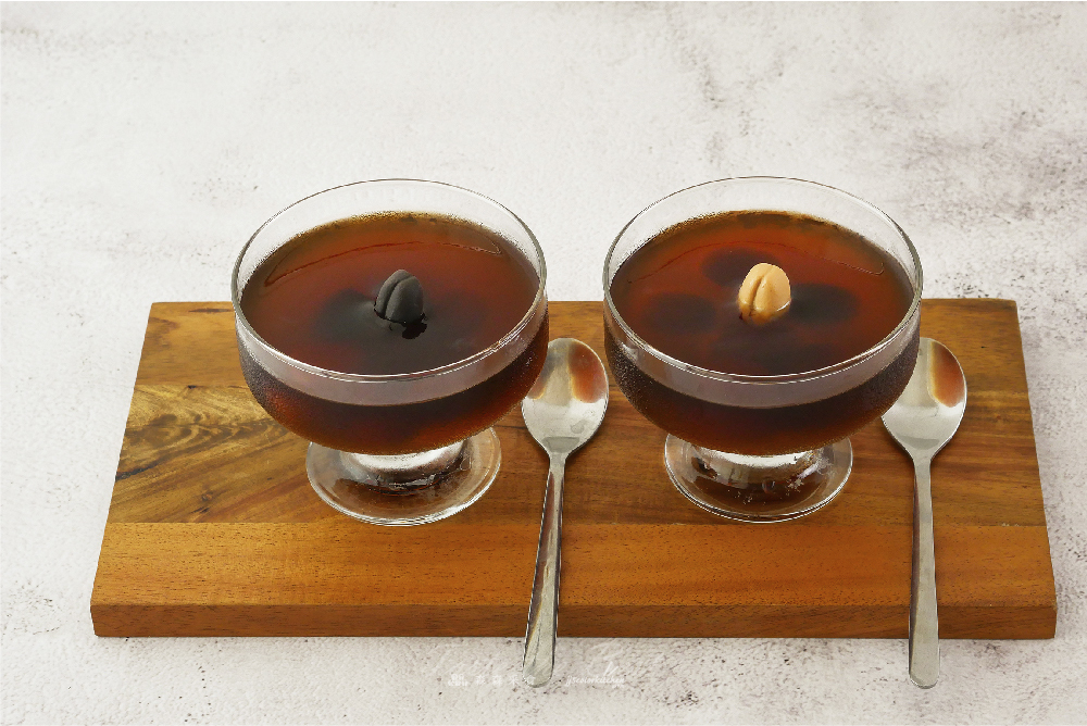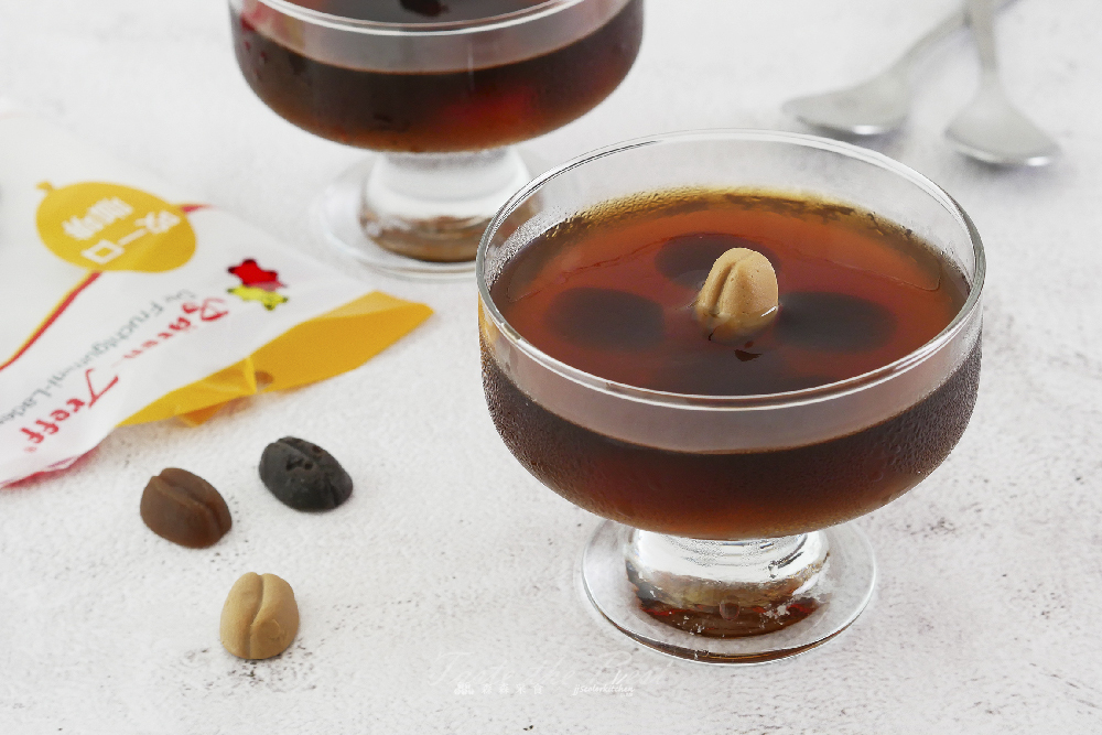趁熱分裝在果凍杯,靜置冷卻約十分鐘,放入4-5顆【咬一口咖啡】軟糖沉在杯底,放入冰箱冷藏。凝固後可在表面再塞進一顆咖啡軟糖裝飾。