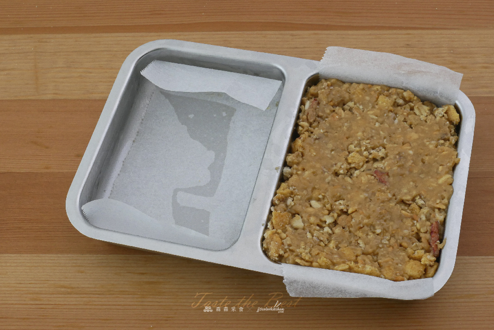 模具墊烘焙紙,將混合好的穀片倒入模具,並用湯匙壓緊。