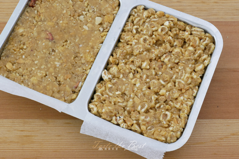 若選用的模具,是圖中的形式,蜂蜜脆香穀片棒與花生醬混合後,也可填入模具另一側(左)。接著放置冰箱,冷藏一晚。