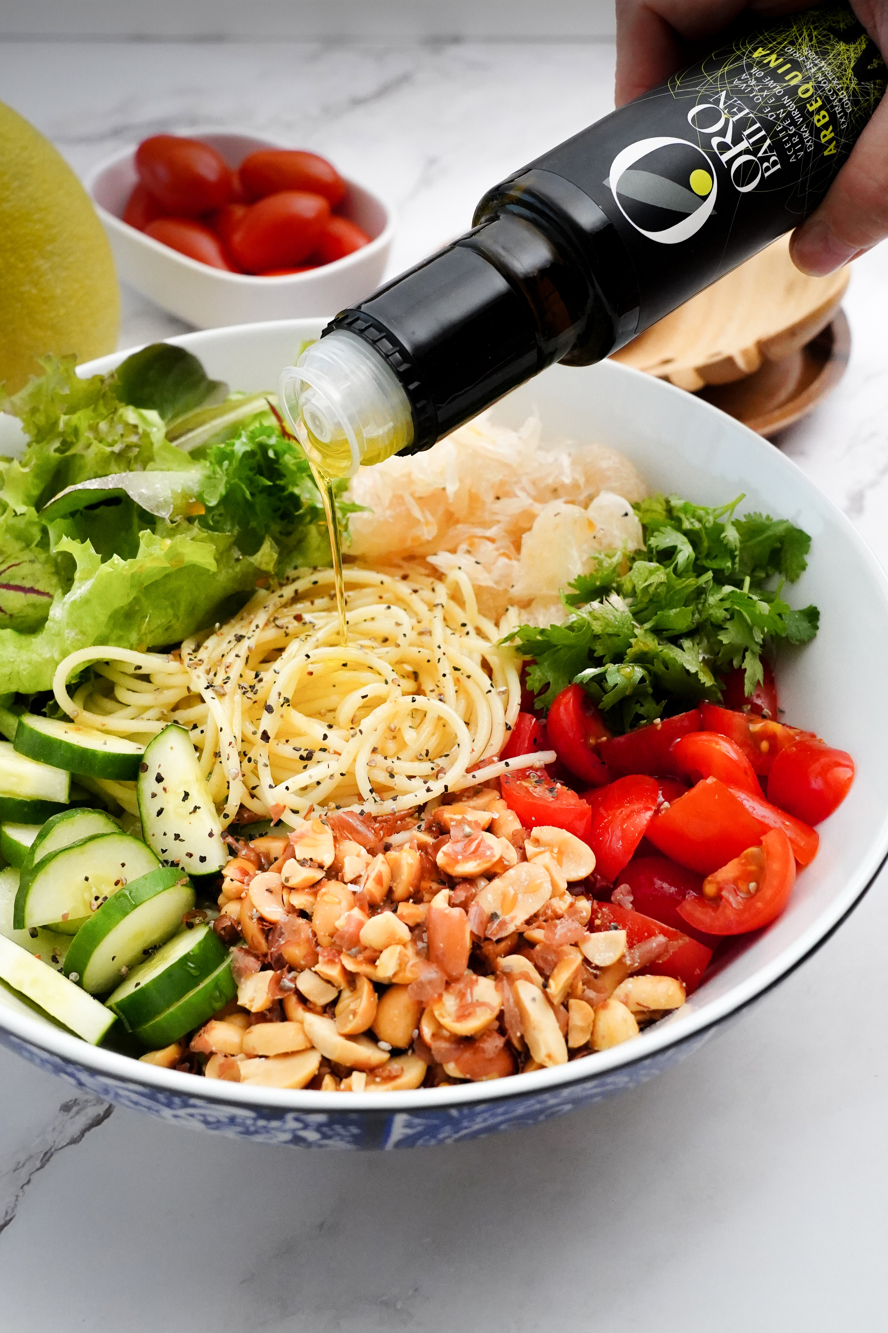 3.將麵條與所有食材放入深碗中,淋上調味料拌勻即完成