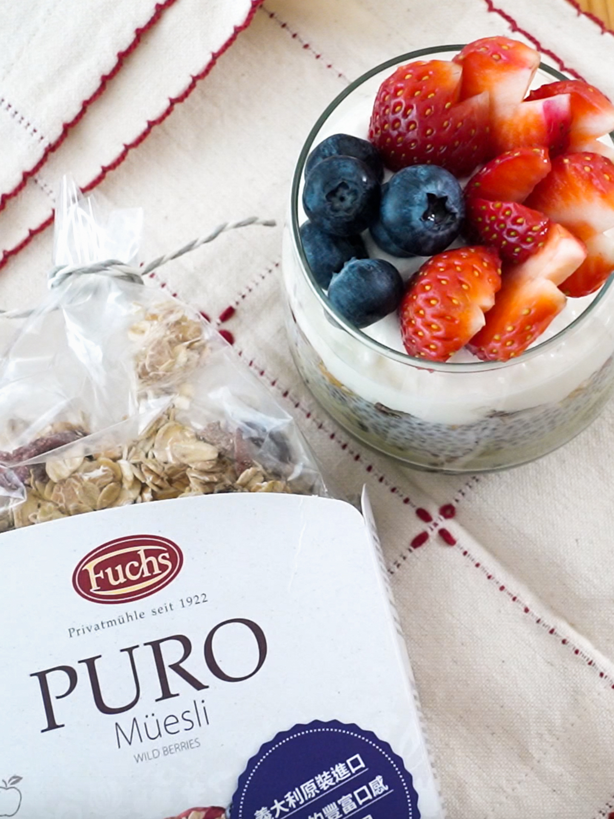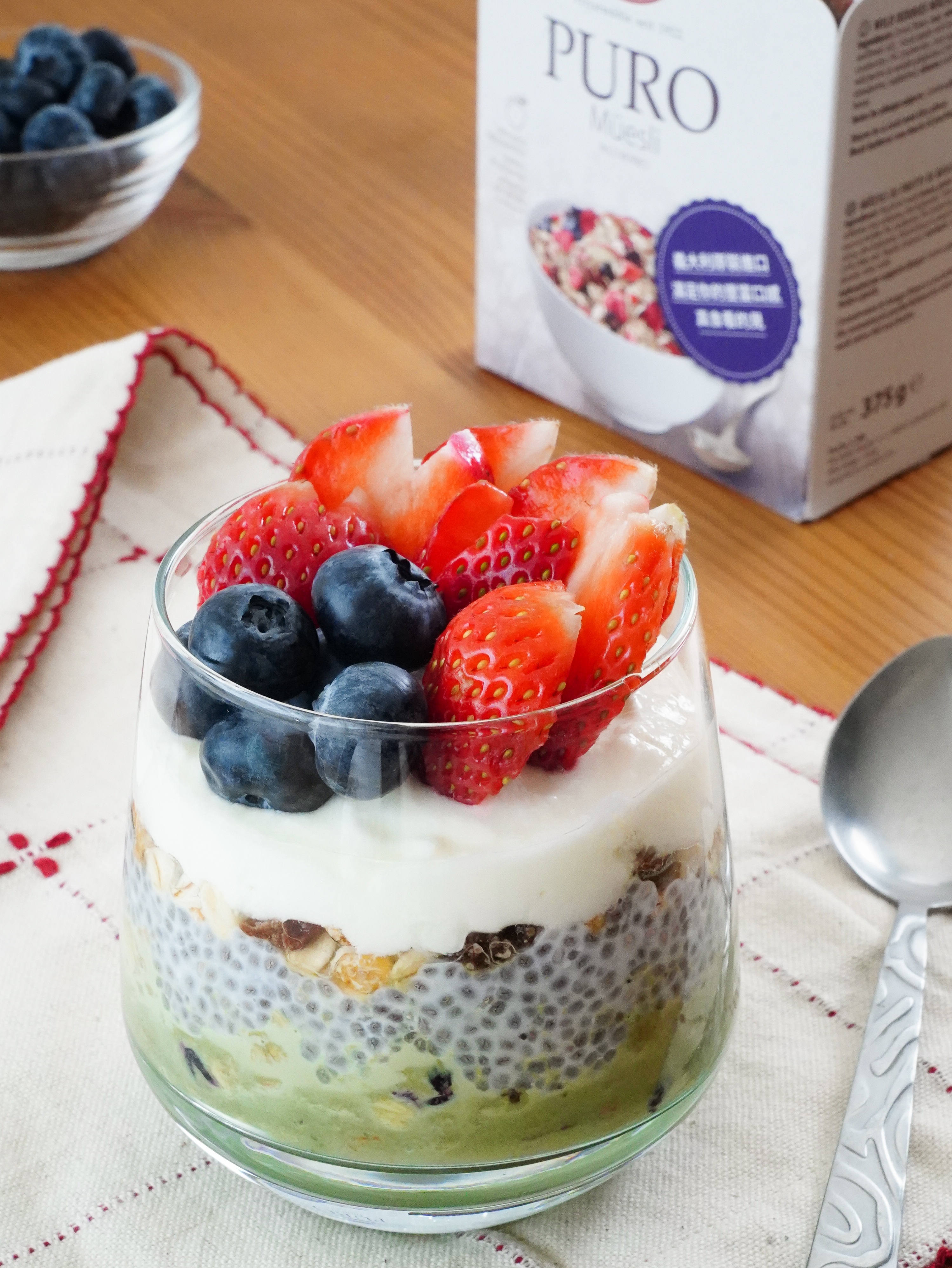 3.取一深杯,依序放入抹茶穀麥片及奇亞籽,鋪上2湯匙[福紅]穀麥片增加脆感,倒入無糖優格,最後在頂層鋪上切好的水果。