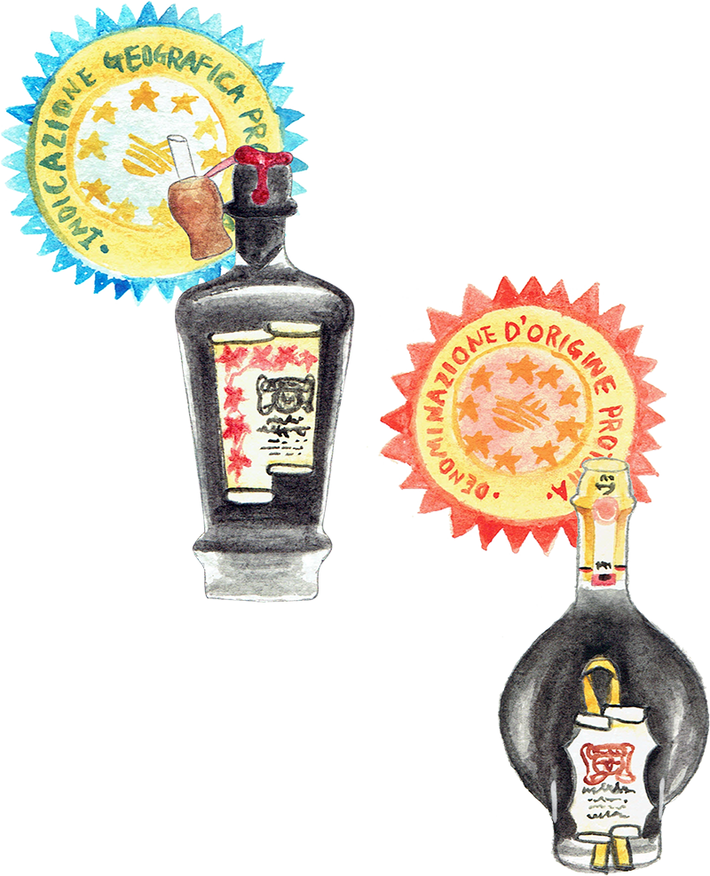 【摩典那的巴薩米克醋】:原文為 Aceto Balsamico di Modena,是受地理標示保護制度 (I.G.P) 認證的醋品,品質相當優異穩定。 和傳統巴薩米克醋不同的是,用來釀造此醋的葡萄沒有產地限制,可以新鮮葡萄汁或搭配不同比例的酒醋製成,但必須在摩典那當地製造、裝瓶才能獲得 I.G.P 認證。也因為在原料的使用上並不限使用特地產區的葡萄,因此摩典那陳醋的風味會較傳統來得有層次且多元。
