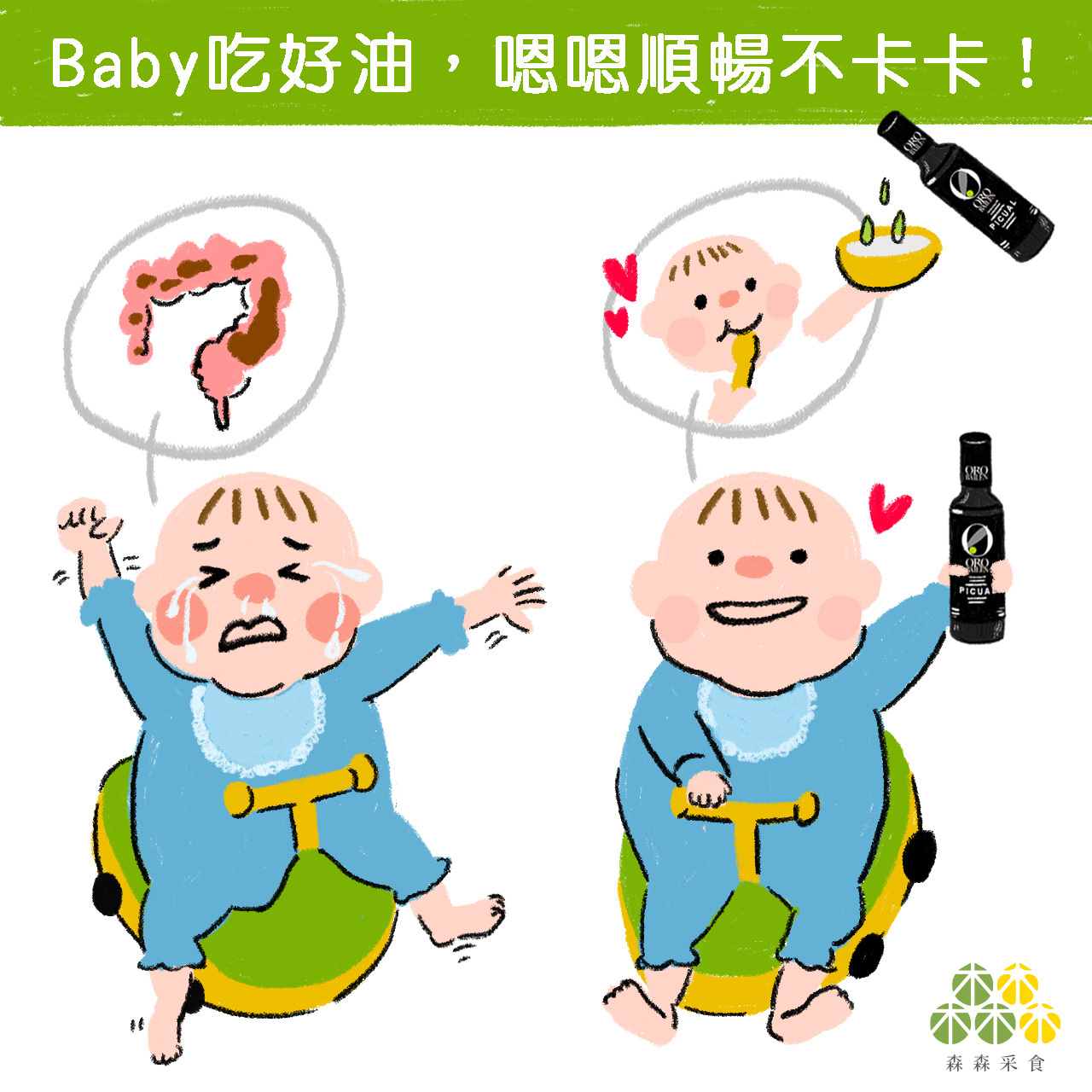 要解決寶寶便祕的困擾,我們可以在寶寶平常吃的副食品中加入幾滴橄欖油,橄欖油不僅可以幫助寶寶腸道潤滑,讓寶寶嗯嗯順暢外,裡面豐富的營養素也能夠為寶寶補充生長所需的營養,在橄欖油的選擇中我們可以選擇特級的冷壓初榨橄欖油,特級冷壓初榨橄欖油能夠完整保存營養素,對寶寶生長來說是最好的選擇,另外橄欖油對皮膚的保濕效果也有非常好的效果,我們可以塗薄薄一層橄欖油在寶寶的肌膚上,就能夠起到非常好的效果,讓皮膚水嫩光滑。