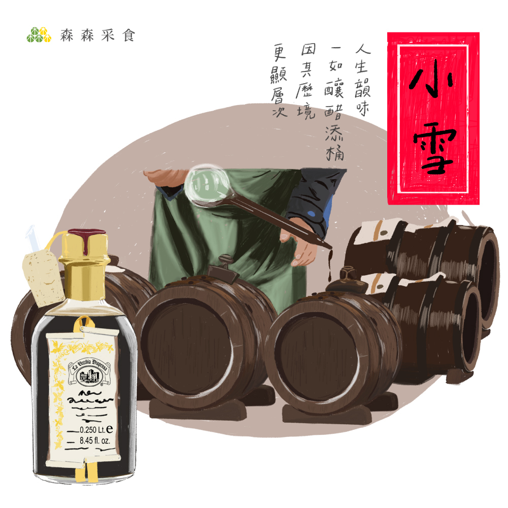小雪時節明顯降溫,台灣溫補話題升溫。而摩地納閣樓中,釀醋師正悉心為巴薩米克醋添桶、換桶,調整風味。酵母菌冬眠之時,也是匠人勞心之際,現在的您正為何奔波忙碌?別急,好事多磨──正如陳醋需靜待時光典釀。