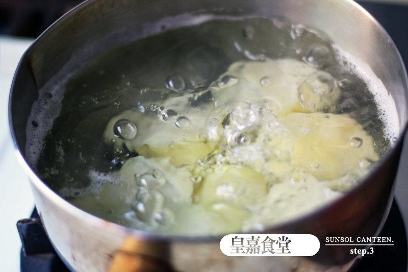 2、用鹽水煮馬鈴薯,水滾後約10分鐘將水倒掉瀝乾。