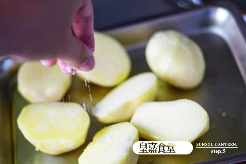 3、在烤盤中將馬鈴薯平舖,再倒入適量橄欖油,撒上適量鹽巴調味。