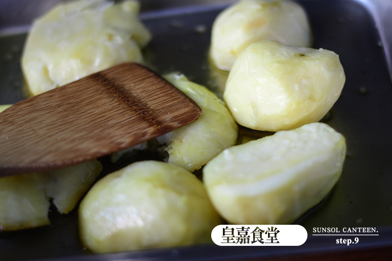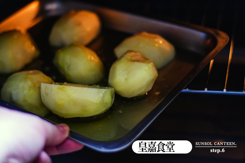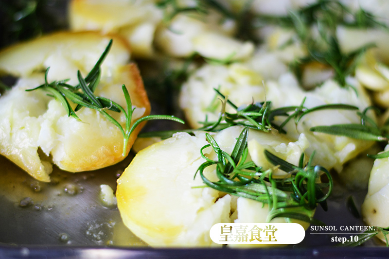 7、將拌好的迷迭香及蒜頭散佈於馬鈴薯上再進烤箱,以190度C再烤20分鐘或烤到您滿意為止。