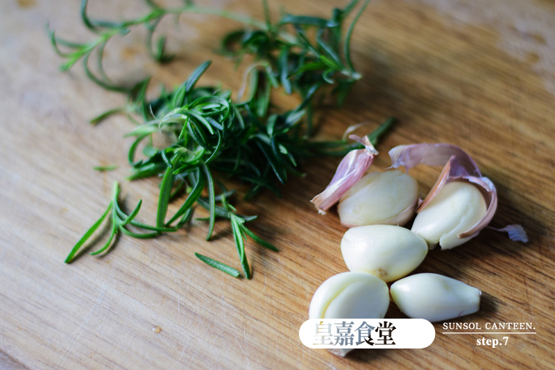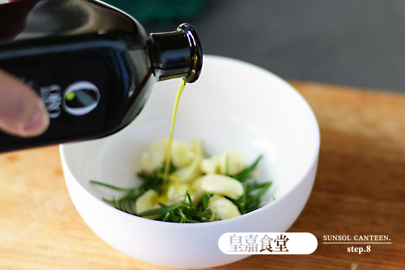 5、將迷迭香洗淨取葉片蒜頭去膜,拌些橄欖油備用。