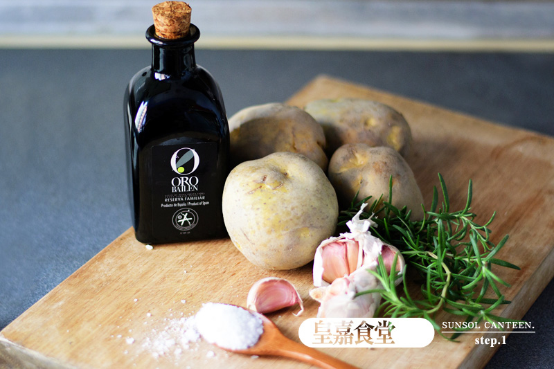 馬鈴薯 / 數顆、蒜頭 / 數顆、迷迭香 / 數支 (也可使用鼠尾草、橙皮等...產生不同風味 )、冷壓初榨橄欖油 / 適量(亦可用奶油或鵝油表皮更加酥脆 )、鹽 / 適量、黑胡椒 / ( 可不放 )